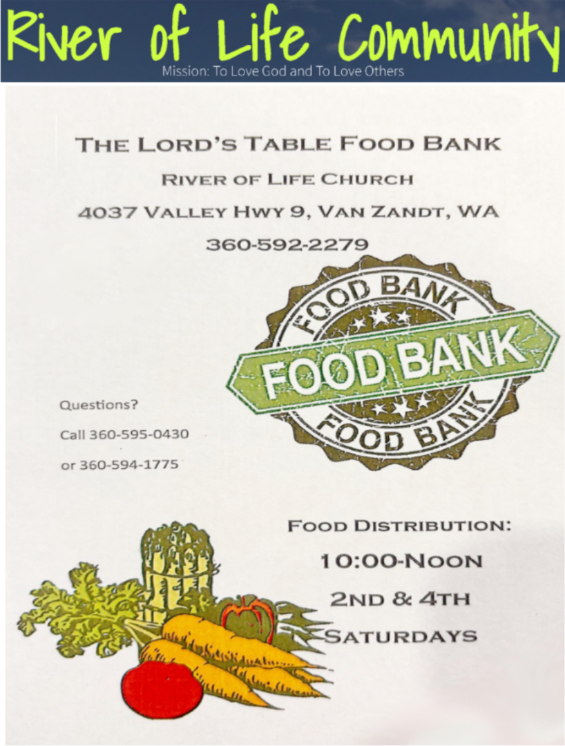 River of Life Community The Lord's Table Food Bank River of Life Church 4037 Valley Hwy 9, Van Zandt, WA 360-592-2279 Qestions? Call 360-5595-0430 or 360-594=1775