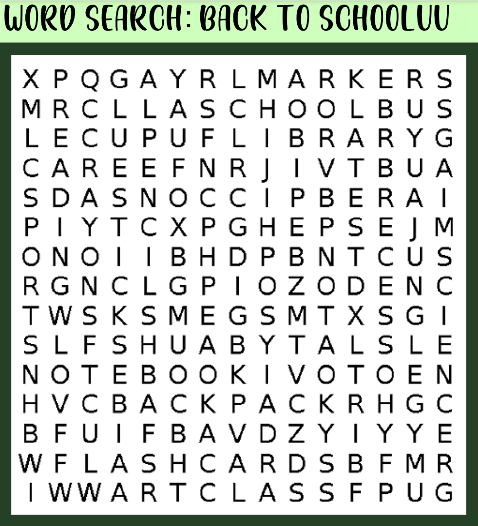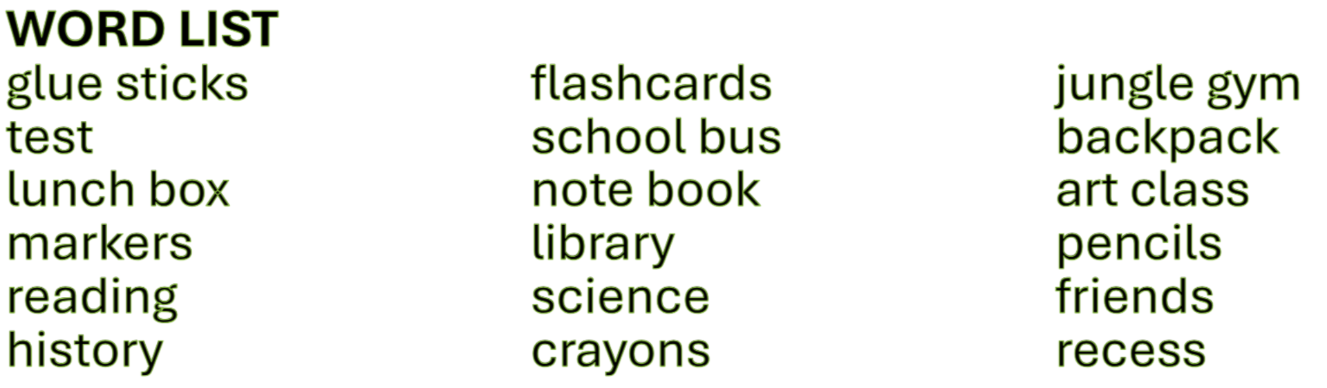**WORD LIST** glue sticks flashcards jungle gym test school bus backpack lunch box note book art class markers library pencils reading science friends history crayons recess